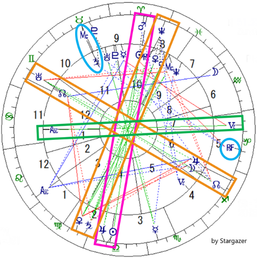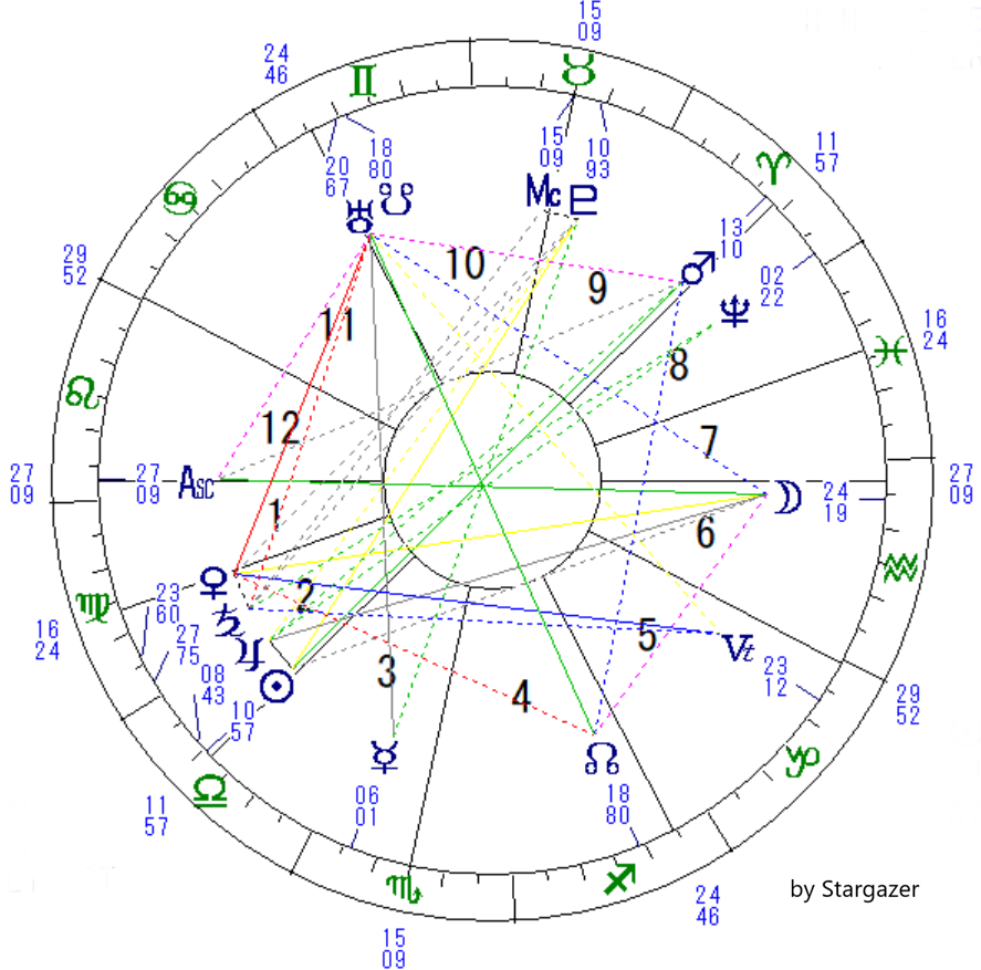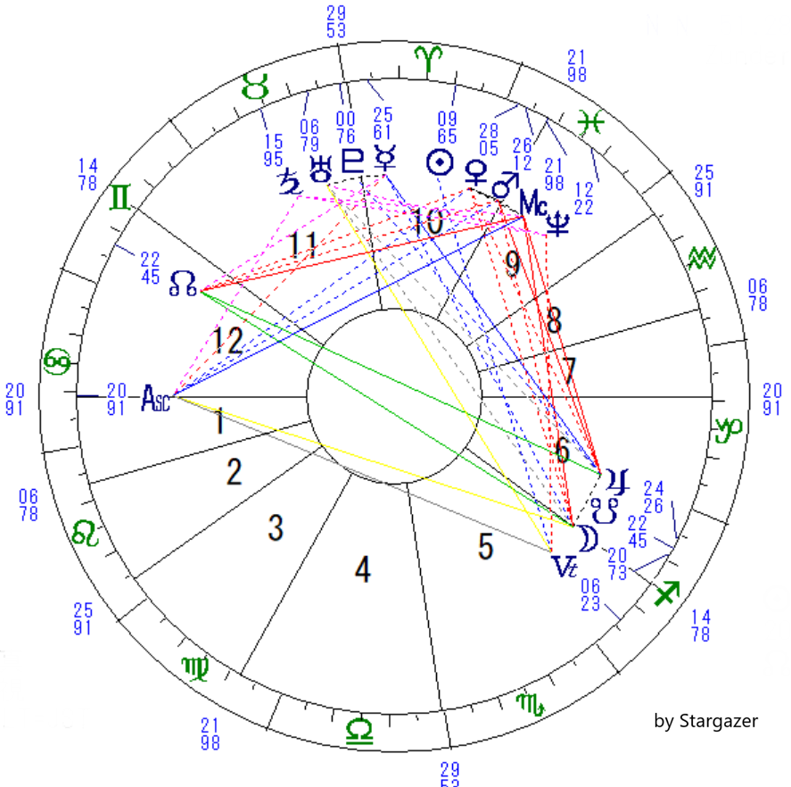 ノーアスペクトの10H牡羊座太陽=天王星/海王星=水星/木星=水星/ノード。牡牛座0度の冥王星は天王星-水星と11Hで合、射手座木星とトライン。