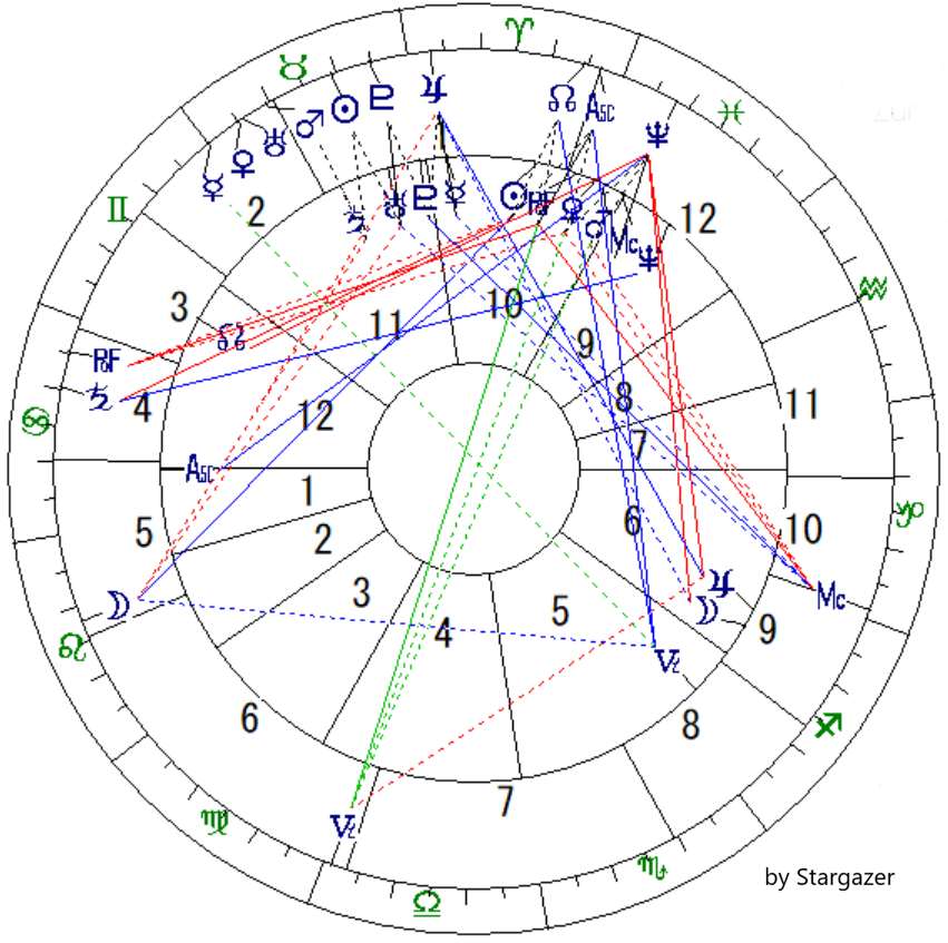 乙女座金星-土星合に天王星-テイルがスクエア、魚座海王星がオポジション。天秤座太陽-木星合に牡羊座火星がオポジション。月も6~7H水瓶座。