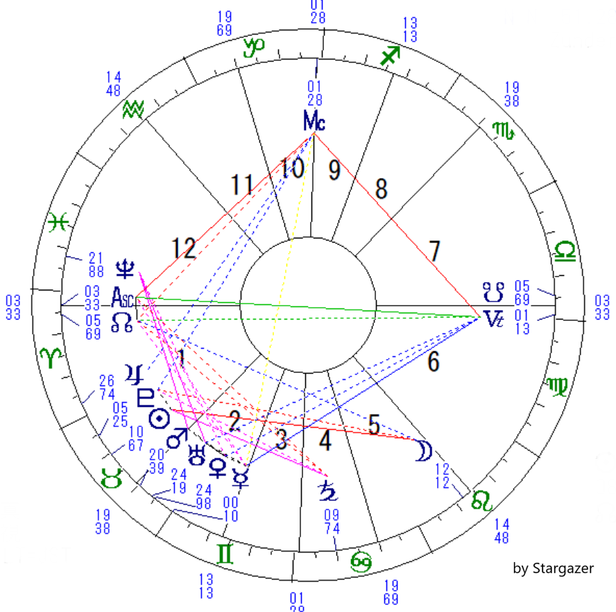 ミッドポイントではAP=火星/天王星。Asc/MC=火星/土星。とんがった感じのキャラクター・先進的な考え方、努力家で仕事ができるタイプ。またうまくいかない時には躊躇せず方向転換できる判断力にも優れていたのでしょう。