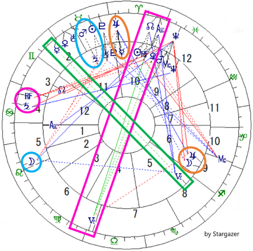 ヨーのMC冥王星合、MC支配星金星が2H土星と合、8H海王星とオポジション。この8H支配星が8H回帰、2H(~3H)に流れている点からも、いわゆる「遺産相続する流れ」は持っていると言えます。